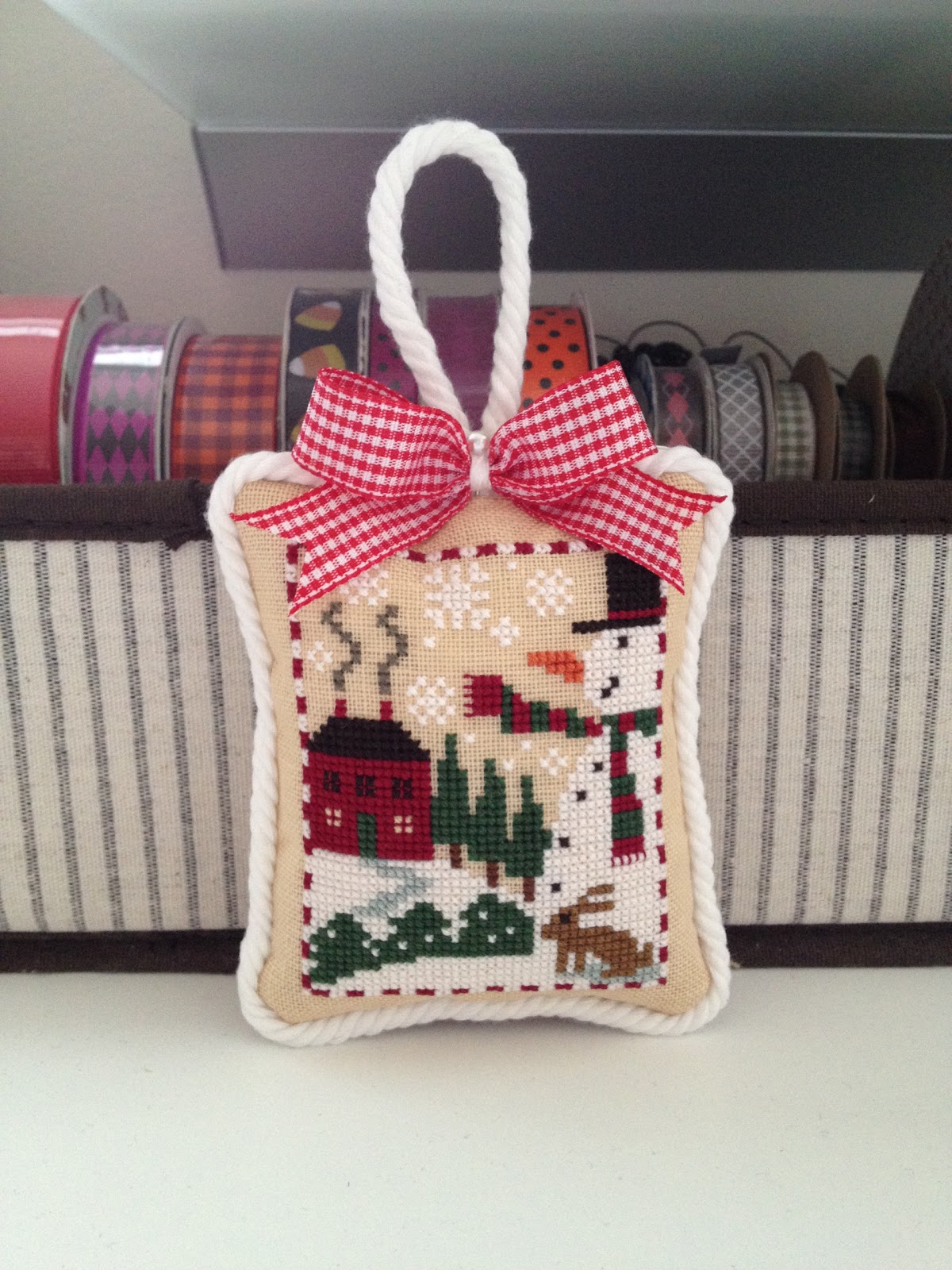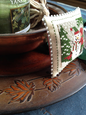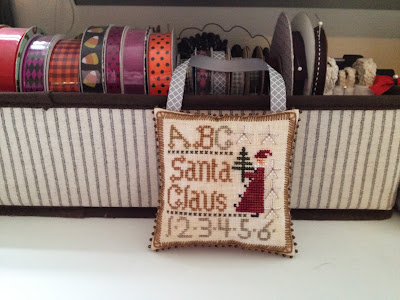 Perching on my stitching shelf; I have it all finished and most of Three Pigs, too. And a few smalls. But, finishing? Hah!