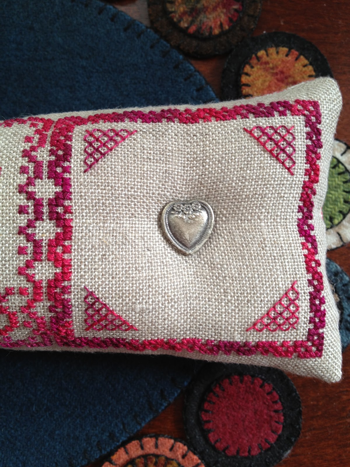 I made pincushion for use with my sewing machine/quilting during the Christmas season, while I was making gifts. The backing is a crisp blue seersucker.